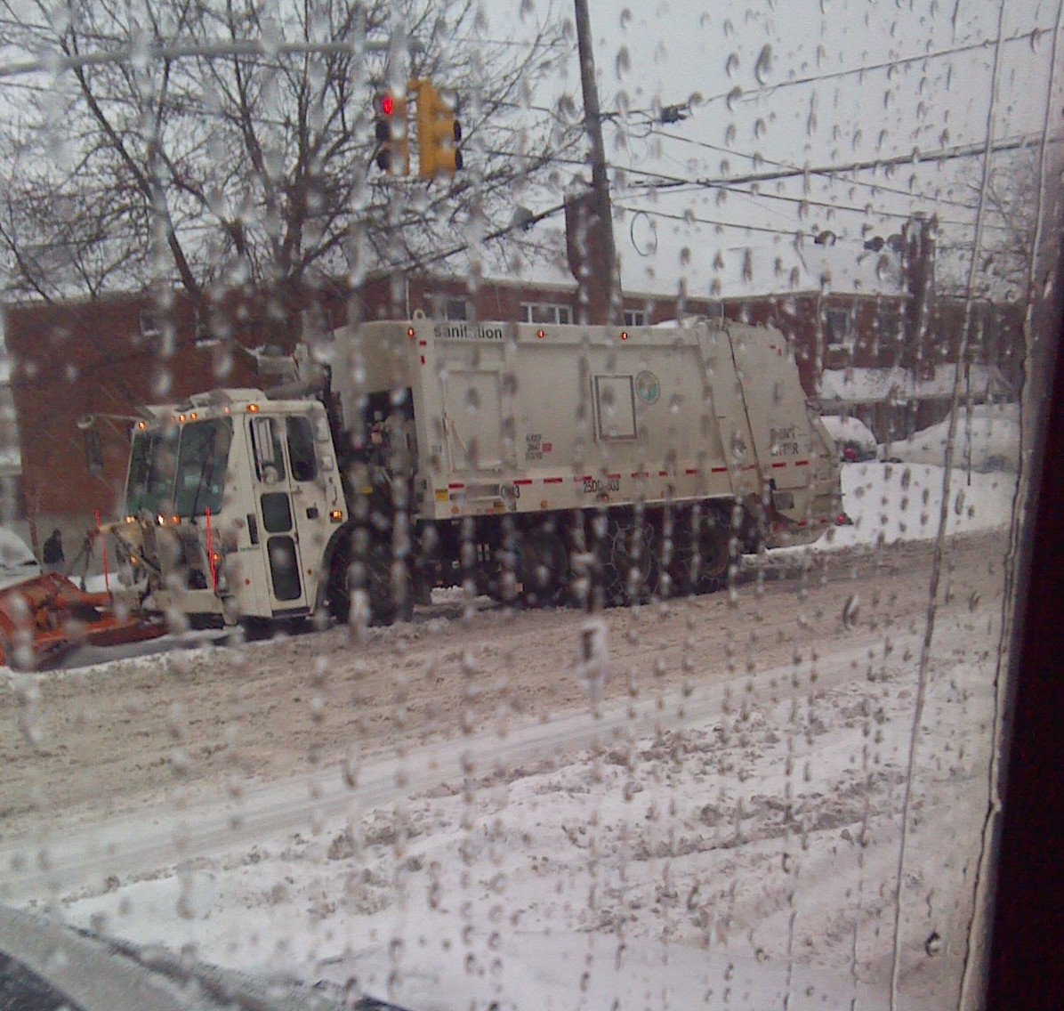 Garbage PlowSpeaking of stepping out and slipping, above is a picture of what happens in Queens when it snows like crazy: garbage trucks, retrofit as snowplows, leave the trash where it sets and put their backs into shoving other accumulation out of the public’s way.