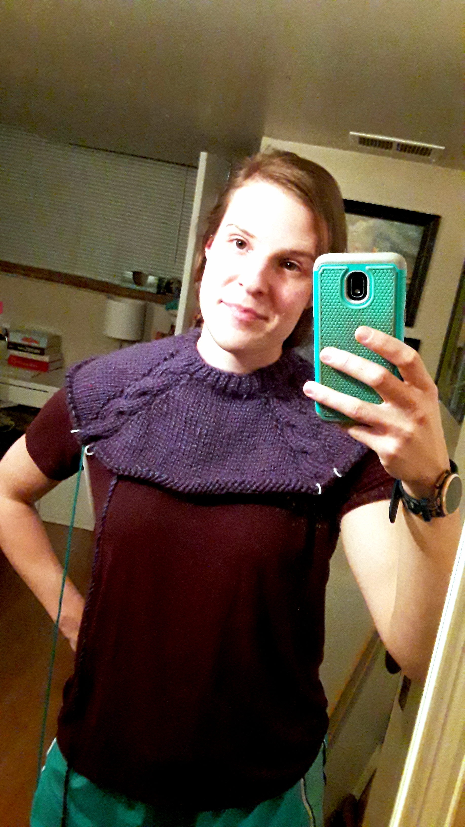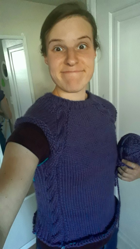 About this time 12 months ago, I shared that I was knitting my first sweater, a striped, chunky, ugly thing I’d decided I’d probably never wear in public. Well, I finished that project in early 2021 and this past August, donated it to Arc Thrift Stores (who knows who’s wearing it now!), but that horrendous piece was not the end of my sweater knitting journey. This fall, I started another with my favorite purple yarn and a pattern I’d saved.