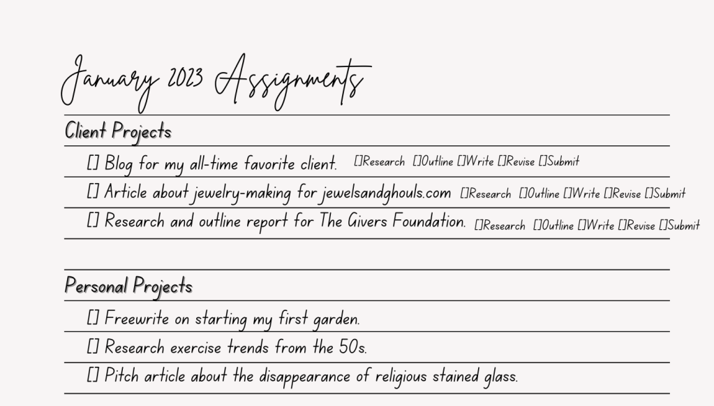 In the new year, I’m planning to experiment with ghostwriting, work on a newsletter or two, and do more writing and editing for university magazines. I’m hoping to engage more of my strategic and project management skills, which come in handy for freelancing but can also be useful to my clients.