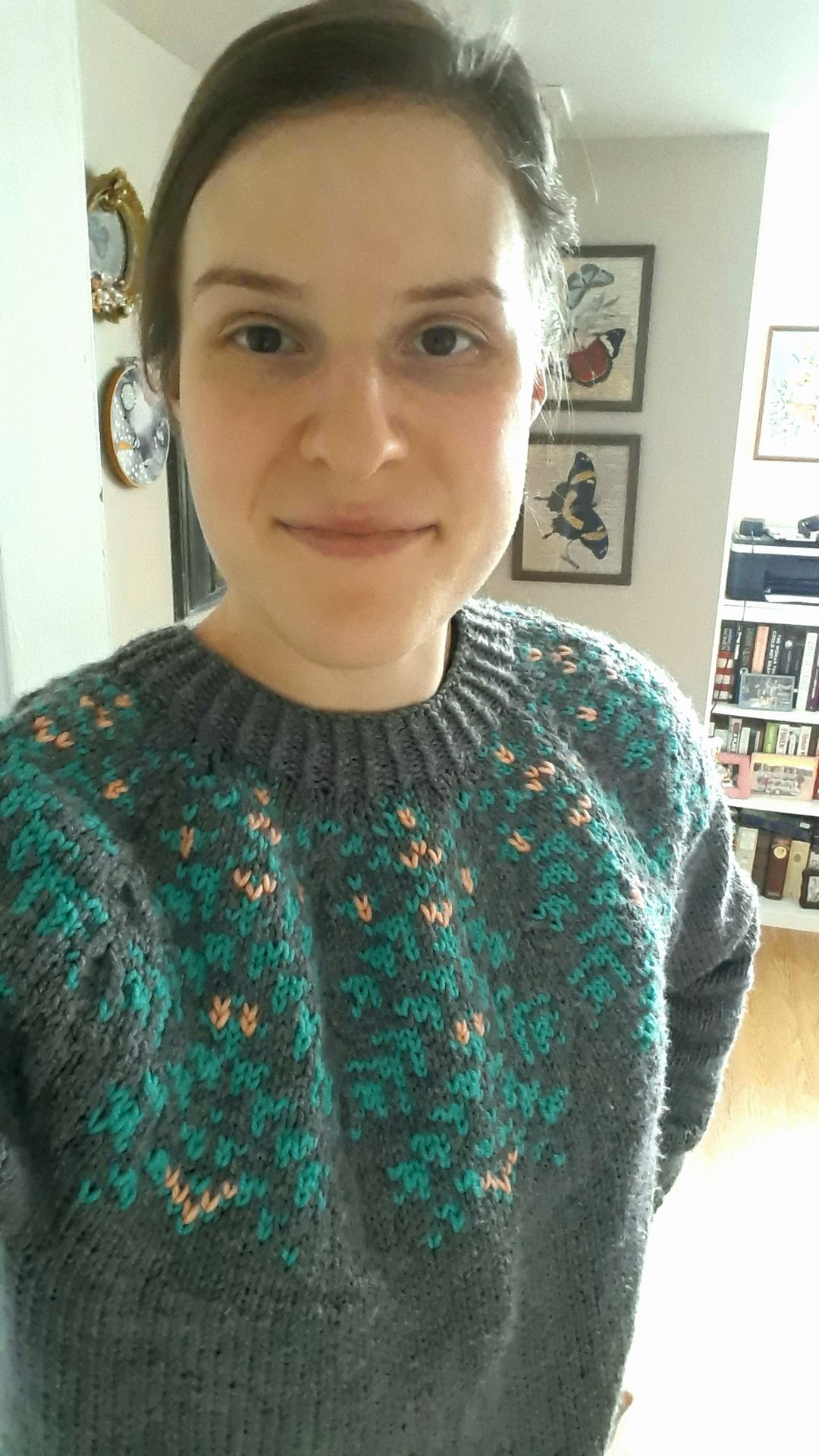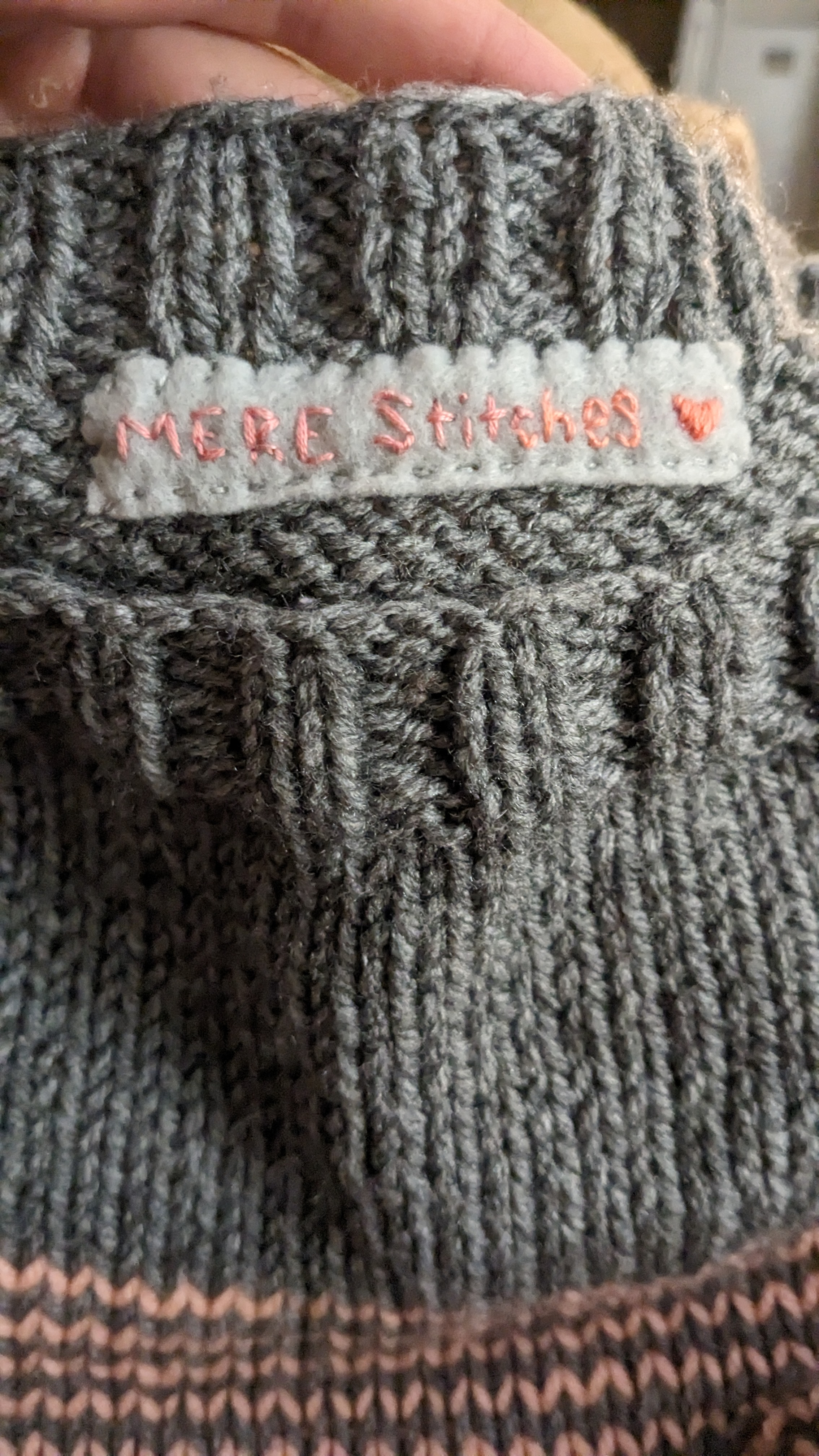 When I started knitting sweaters, I originally thought I would do one each winter, but last winter, one of my favorite knitwear designers and YouTubers Kutovakika released her Arctic Light Sweater pattern. I bought the pattern and a stockpile of yarn and started working on mine as soon as I finished my colorwork sweater of a similar name, First Light. I didn’t finish the cabled sweater until the summer — just in time for a break from knitting that left me refreshed enough to volunteer to knit a sweater without a pattern for my short-term roommate this fall. We co-designed the striped and colorbock raglan sweater, and I made it over several weeks, completing it with a homemade tag I embroidered. Sweater knitting is definitely time-consuming, but it’s exciting to have the skills now to just start knitting, no pattern required. And the final product is satisfying.