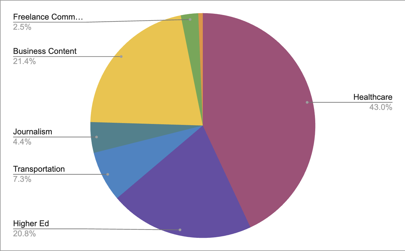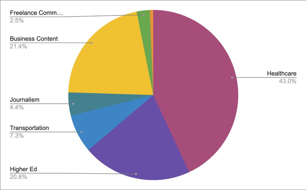 - Healthcare clients provided about 43% of my workload, a stat that I’m happy to see. When I left my healthcare communications job in 2024, I wanted to use that experience to do more work in health and science. A combination of freelance networks, existing relationships, and local connections helped me land a variety of projects in this sector. I wrote articles, feature stories, reports, sales worksheets, blogs, and social content. I’m hoping to maintain these client relationships and continue working in this arena next year.