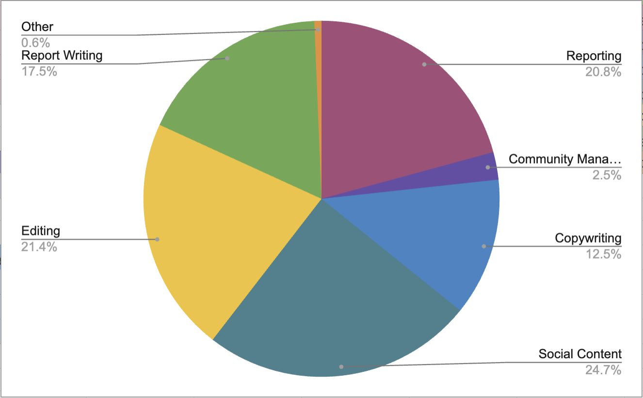 - Copywriting (13%) and report writing (18%) were next, and are also areas I’m aiming to do more work in. I had the opportunity to overhaul and write from scratch a few reports for nonprofit organizations and enjoyed getting to know their work on a deeper level while making it more accessible to their audiences.