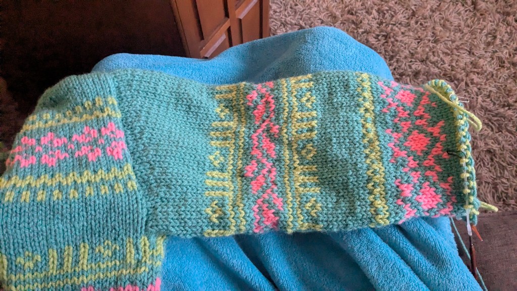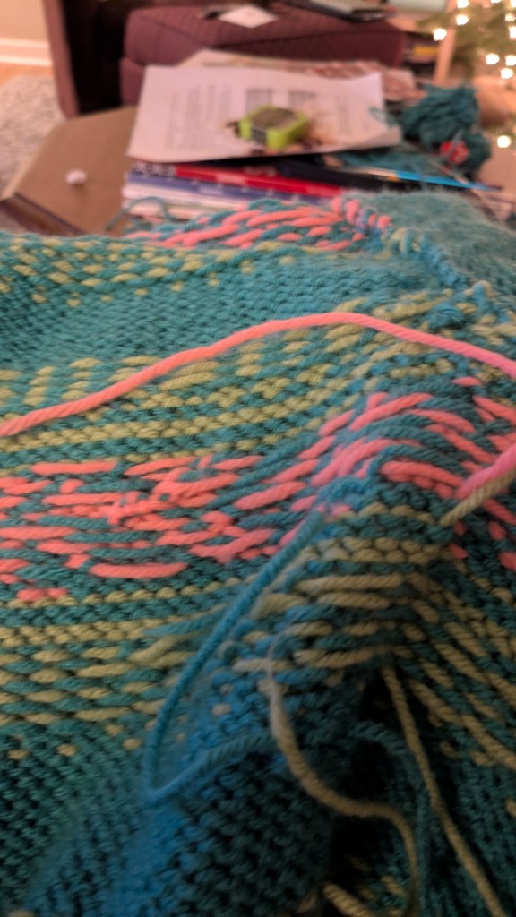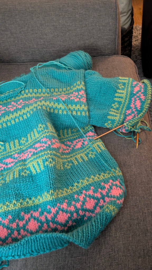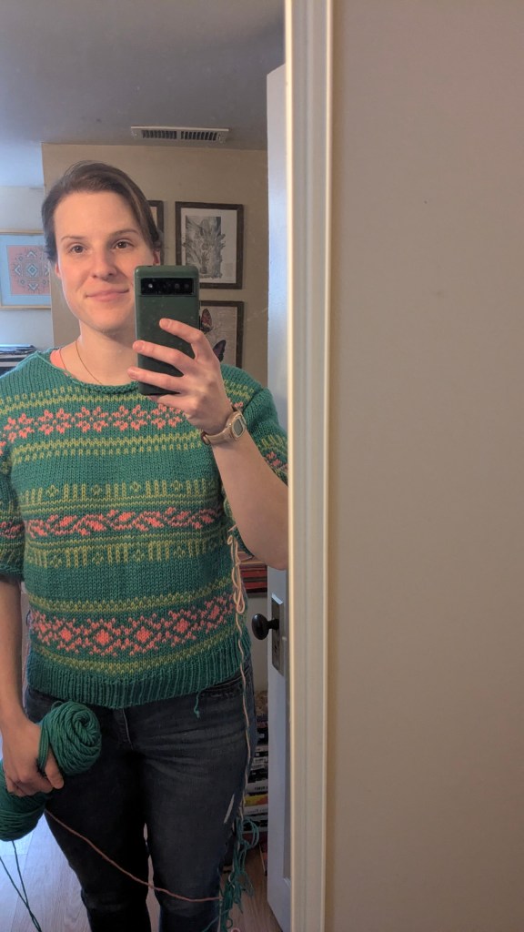 I started a version of this sweater (Porcelain Sweater by LE KNIT) before my surgery so I could knit while I was recovering, but that version ended up being way too big so I started over. Then I didn’t touch the project again until October, after I finished my embroidery project. I still wasn’t sure if it was the right size but I decided to just go ahead and make it. I’d already redone the pattern math once and I didn’t want to do it again. I figured if it didn’t fit me, I could give it to someone else. Turns out, it fit perfectly, and the new colors were way better than what I’d originally chosen. I knit the project slowly through the rest of the year, and finished it the morning of Christmas Eve, after hours of weaving in ends. I put it in a gift bag under the tree so I could anticipate it like a child, and then I opened it a couple days after Christmas. I wore it the next three days.