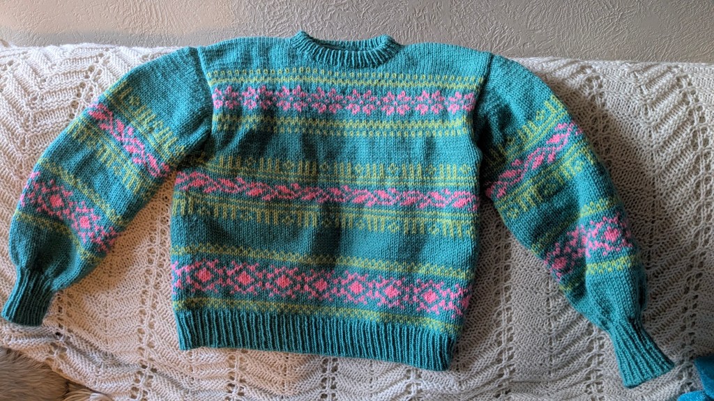 It’s my sixth homemade sweater and by far the best one. Along with redoing the pattern math to work with thicker yarn, I made it more form-fitting (the pattern is designed to be oversized), added German short rows to the caps of the sleeves, and made the sleeves more bubble-shaped instead of open at the wrists. I’m thrilled with how it came out.