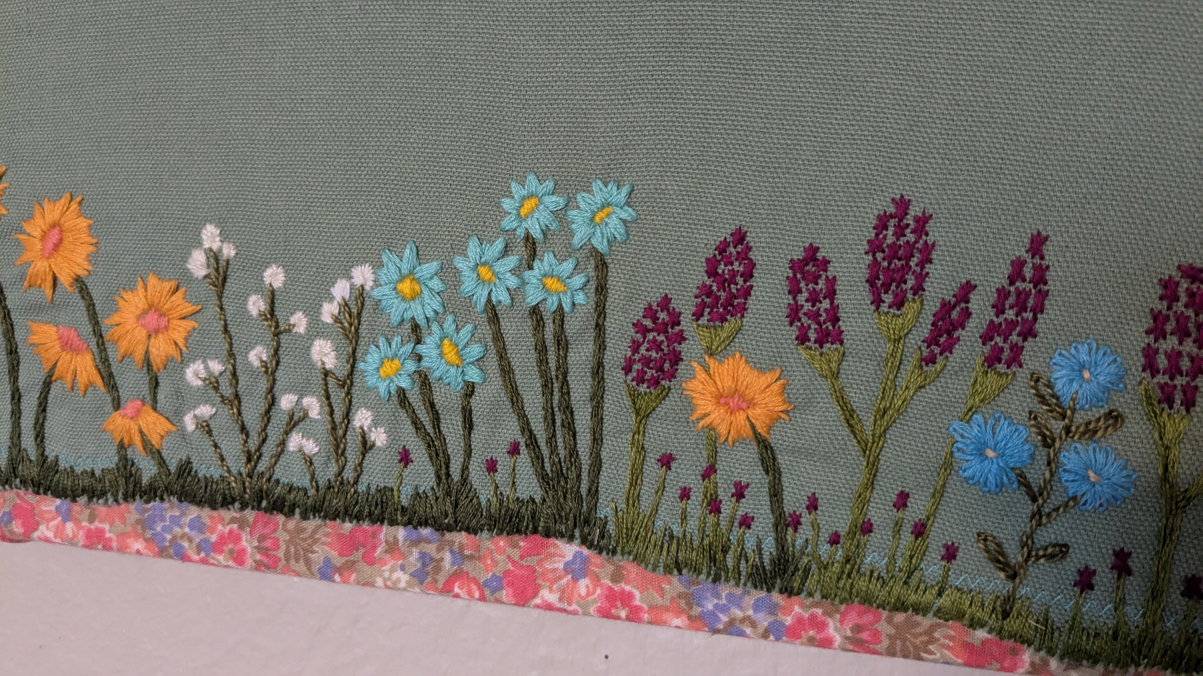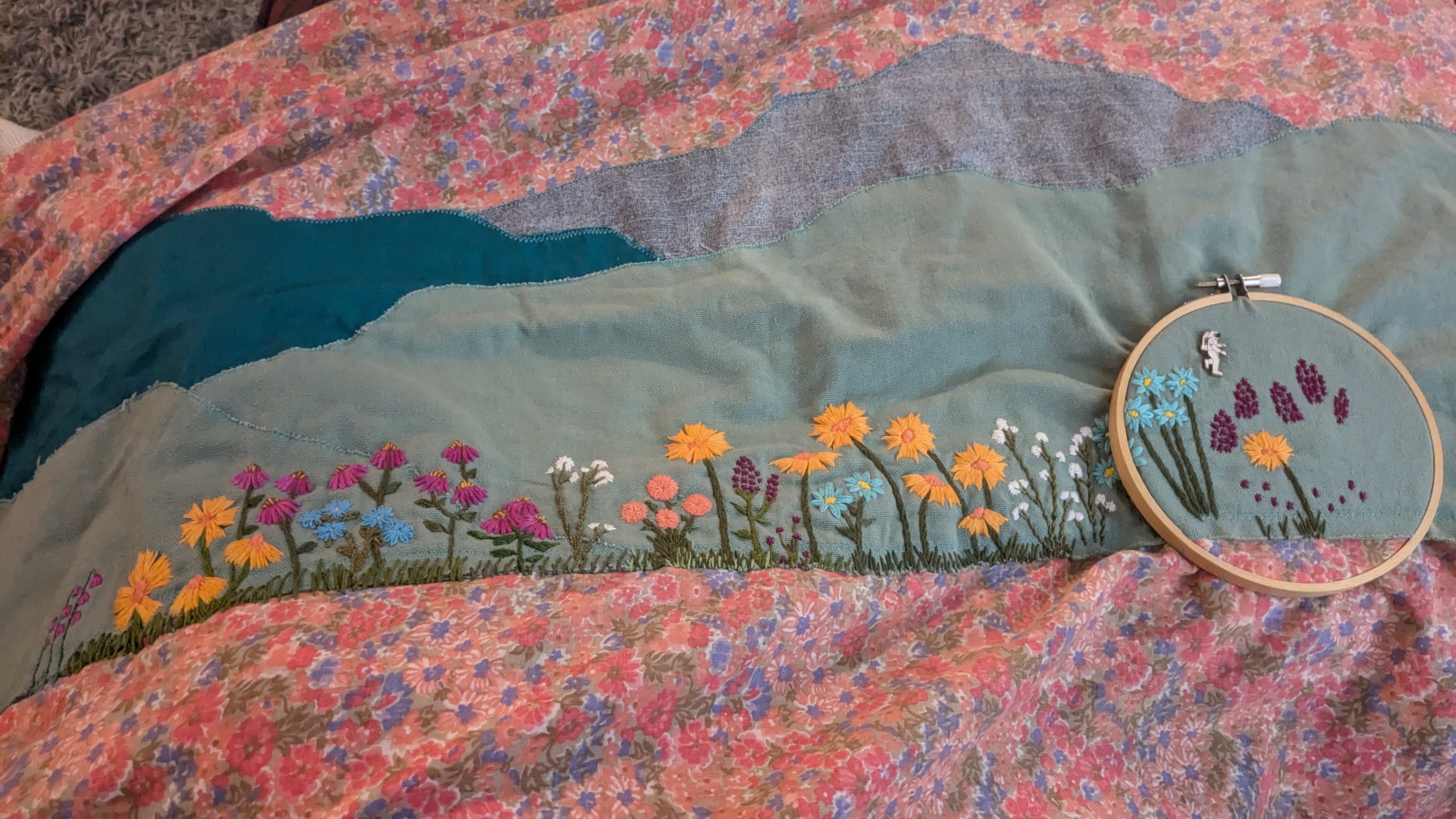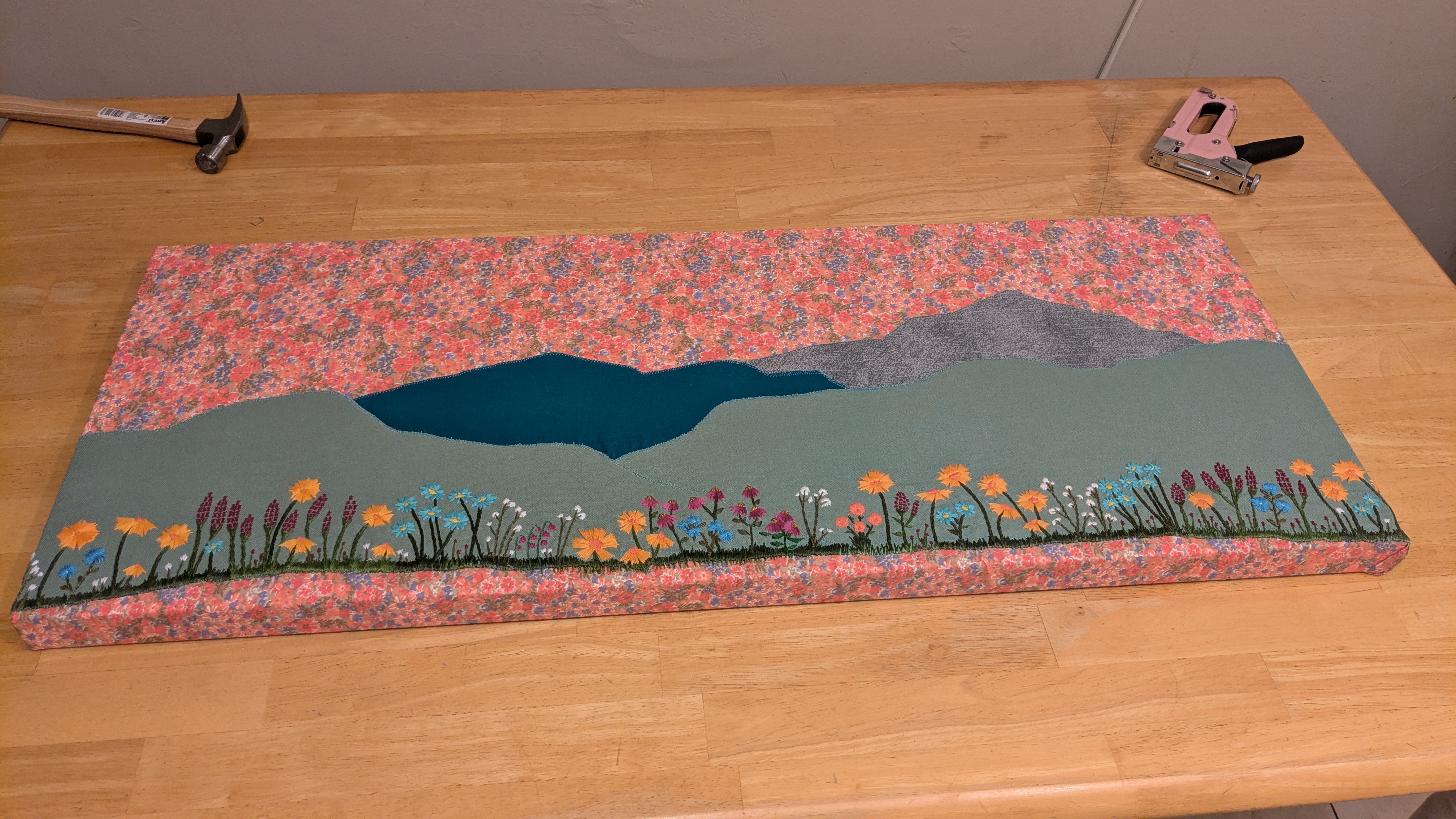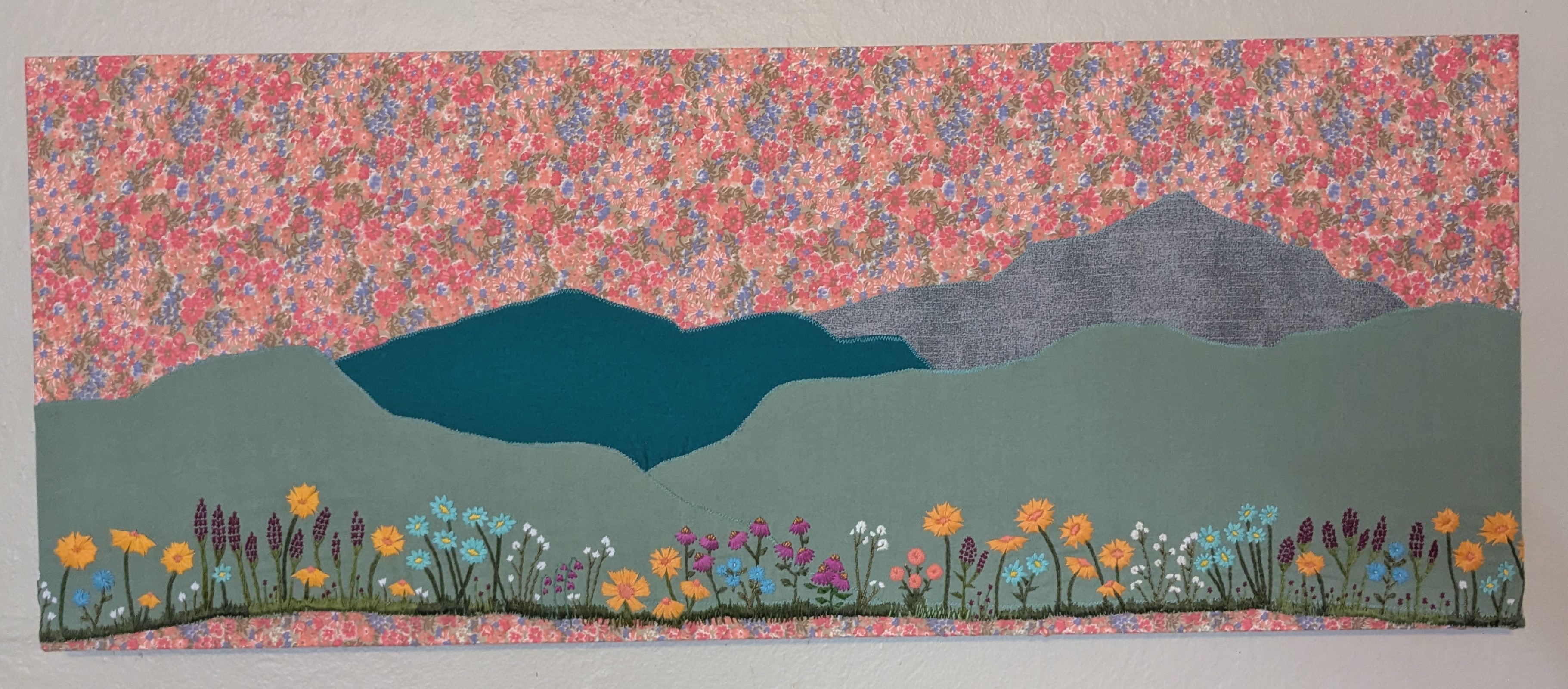 I started this project in 2023 after staring at the background fabric hanging over a blank spot on my living room wall for a few weeks. The mountains are machine-sewn in place. The embroidery is all hand-done. I took this project with me just about everywhere for the two years that I worked on it: my garden, public parks, camping, trips to visit family, etc. I finished it by stretching it over a canvas and stapling it in place. It now hangs in that same formerly blank spot on my living room wall.