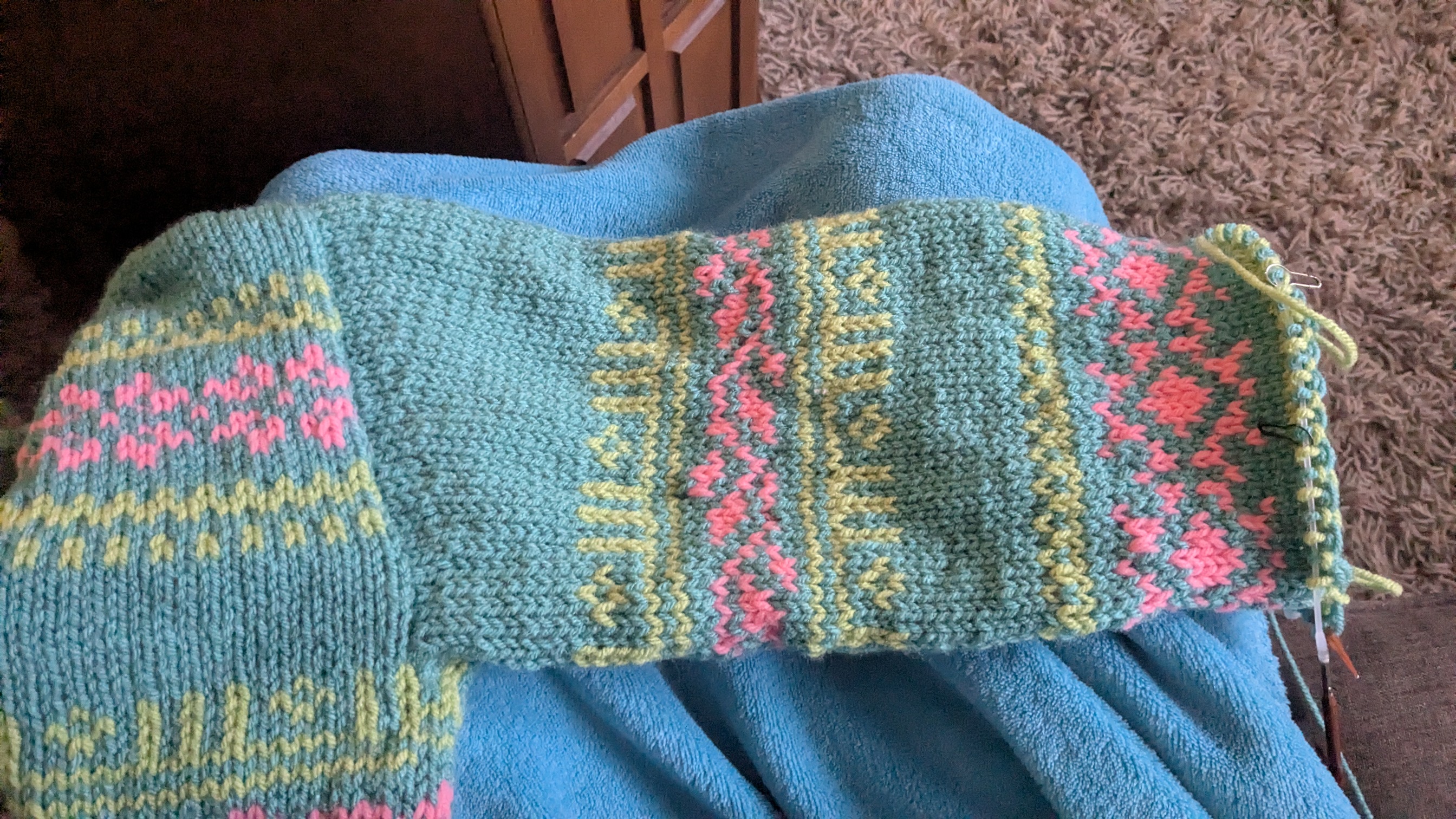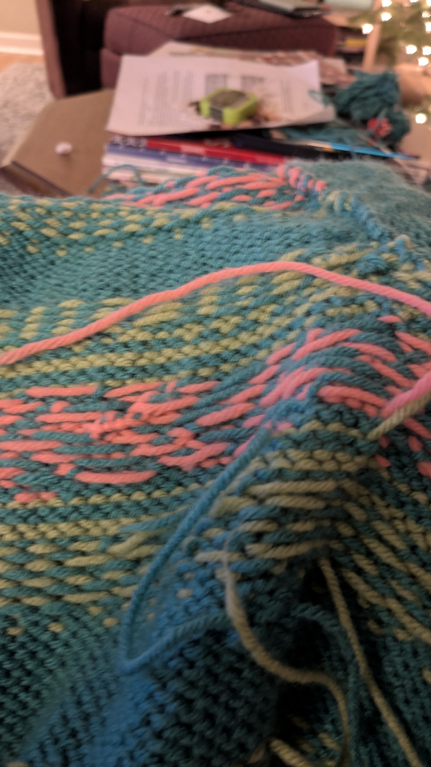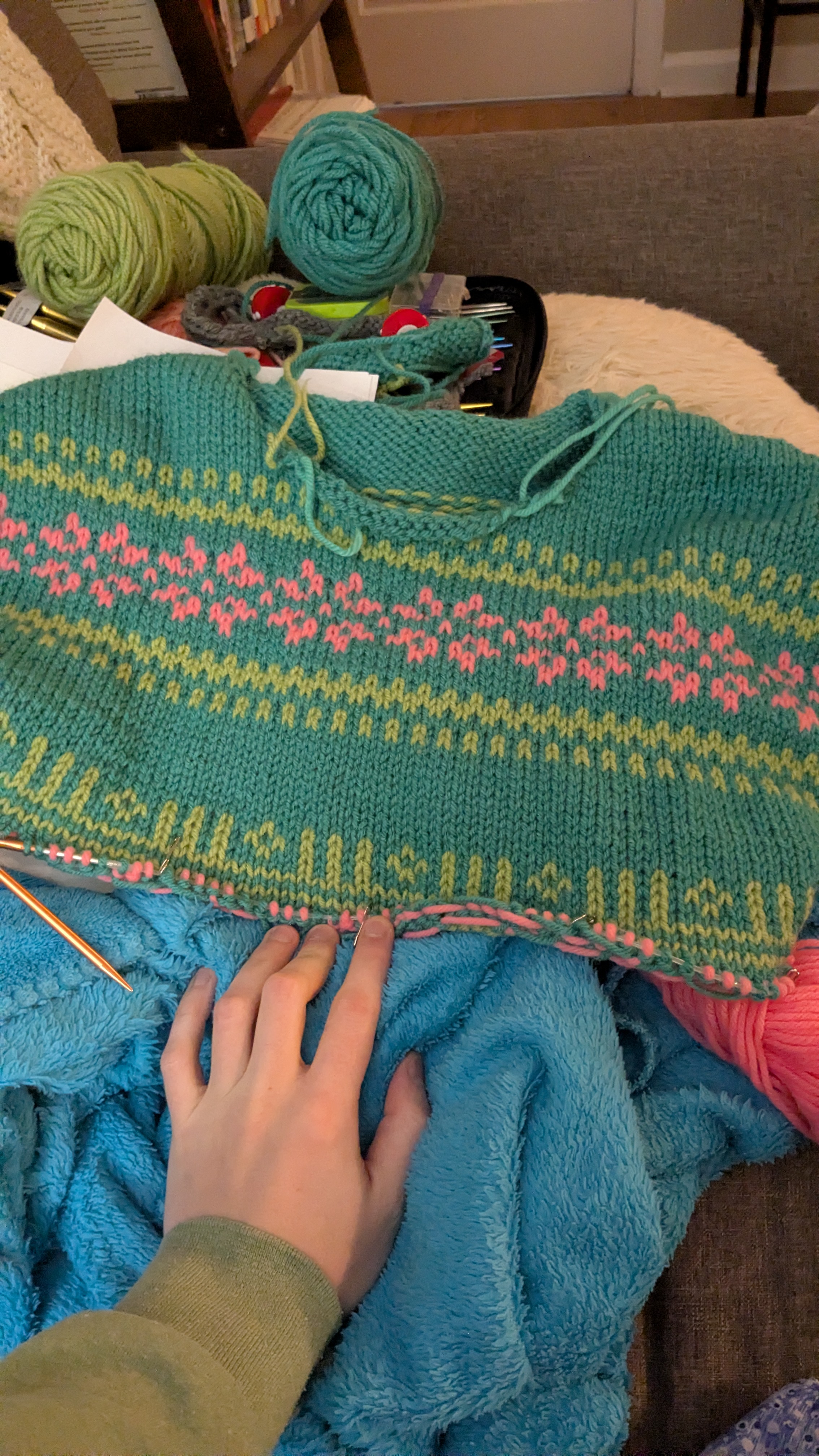 I started a version of this sweater (Porcelain Sweater by LE KNIT) before my surgery so I could knit while I was recovering, but that version ended up being way too big so I started over. Then I didn’t touch the project again until October, after I finished my embroidery project. I still wasn’t sure if it was the right size but I decided to just go ahead and make it. I’d already redone the pattern math once and I didn’t want to do it again. I figured if it didn’t fit me, I could give it to someone else. Turns out, it fit perfectly, and the new colors were way better than what I’d originally chosen. I knit the project slowly through the rest of the year, and finished it the morning of Christmas Eve, after hours of weaving in ends. I put it in a gift bag under the tree so I could anticipate it like a child, and then I opened it a couple days after Christmas. I wore it the next three days.