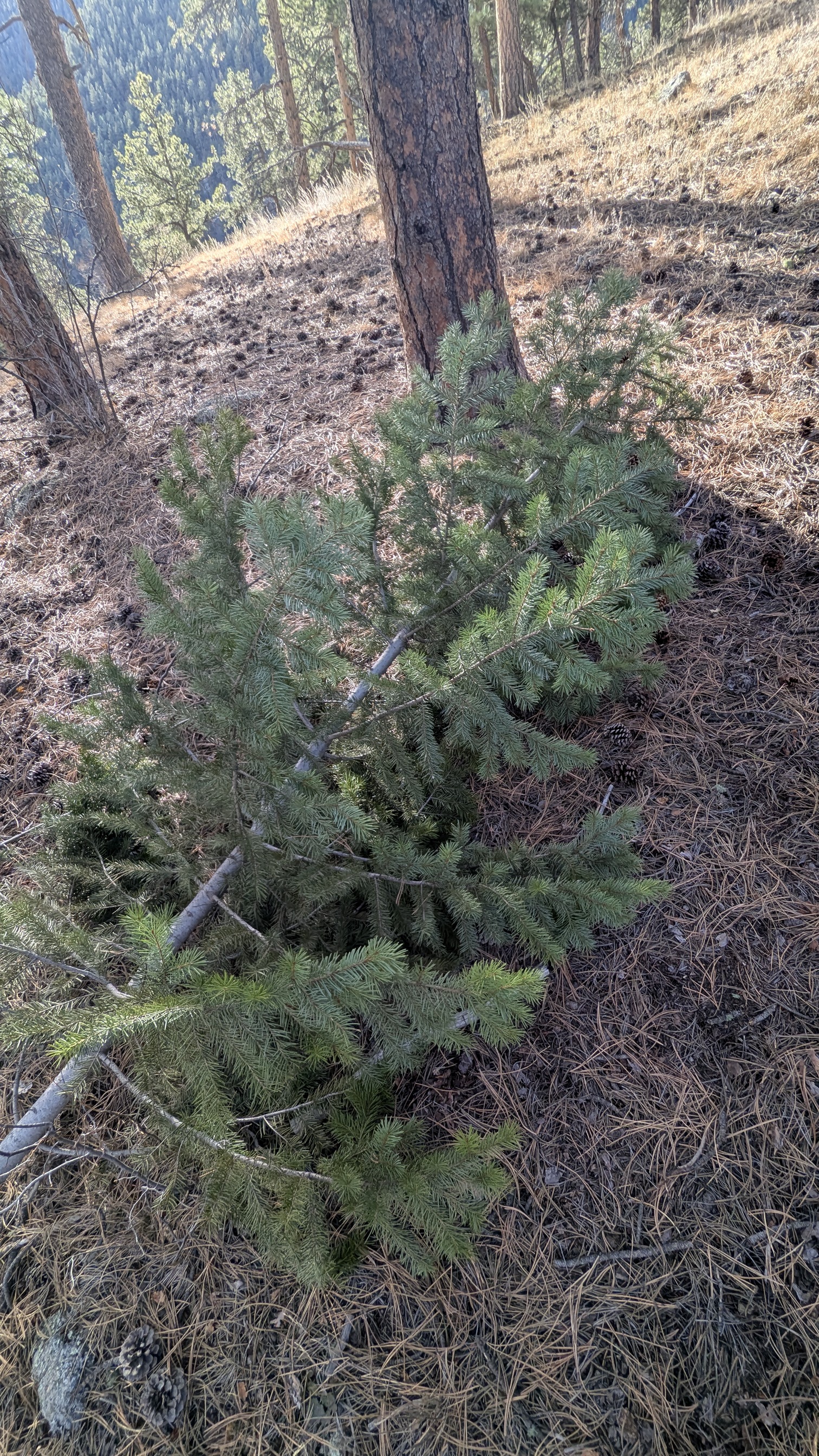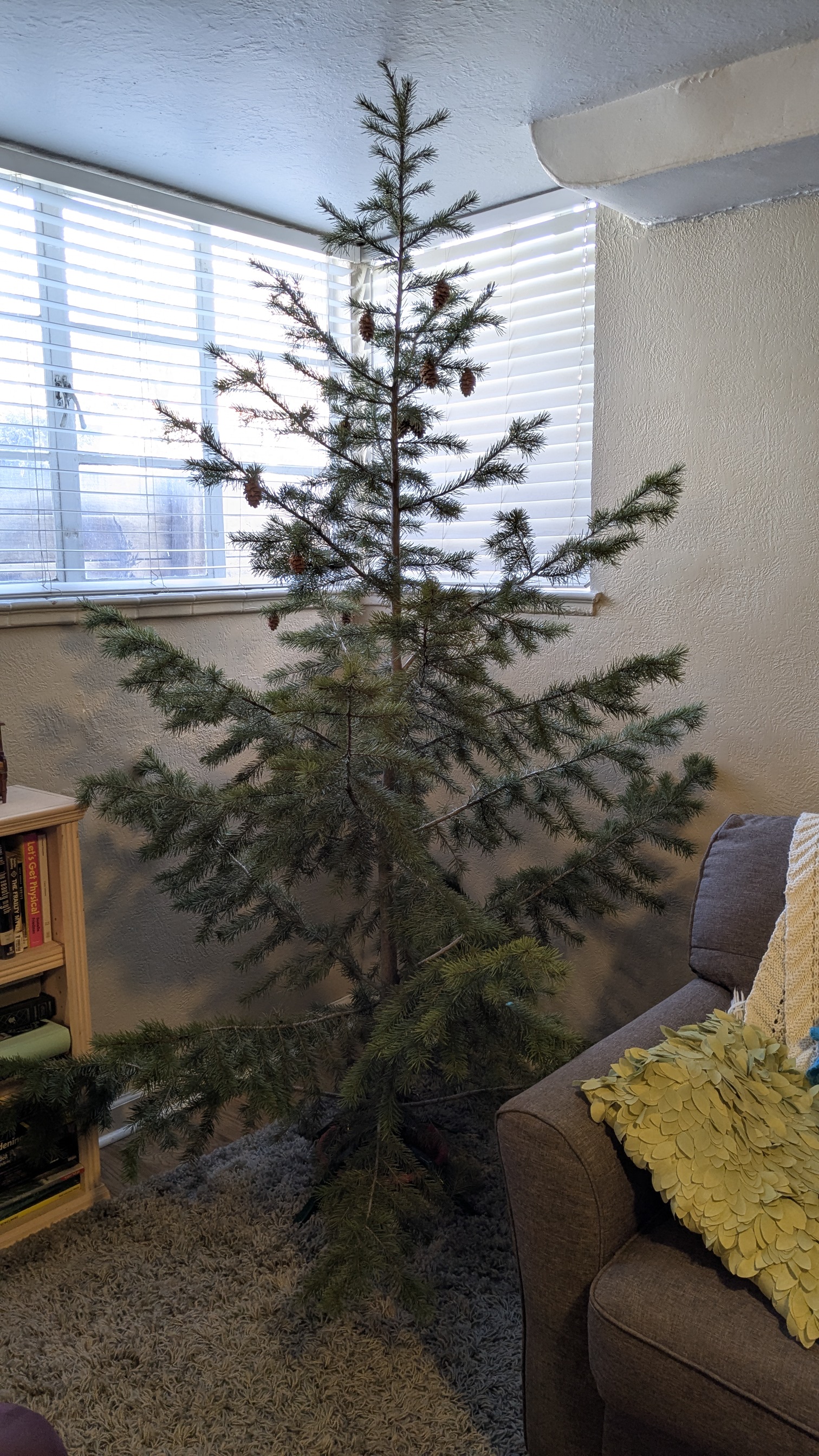 For the second year in a row, my roommate and I took a couple friends to cut down a tree in a designated part of national forest land. We went for a taller tree this time and cut it down to size so it fit perfectly in the living room. My favorite detail: the little pine cones toward the top, like built-in ornaments.