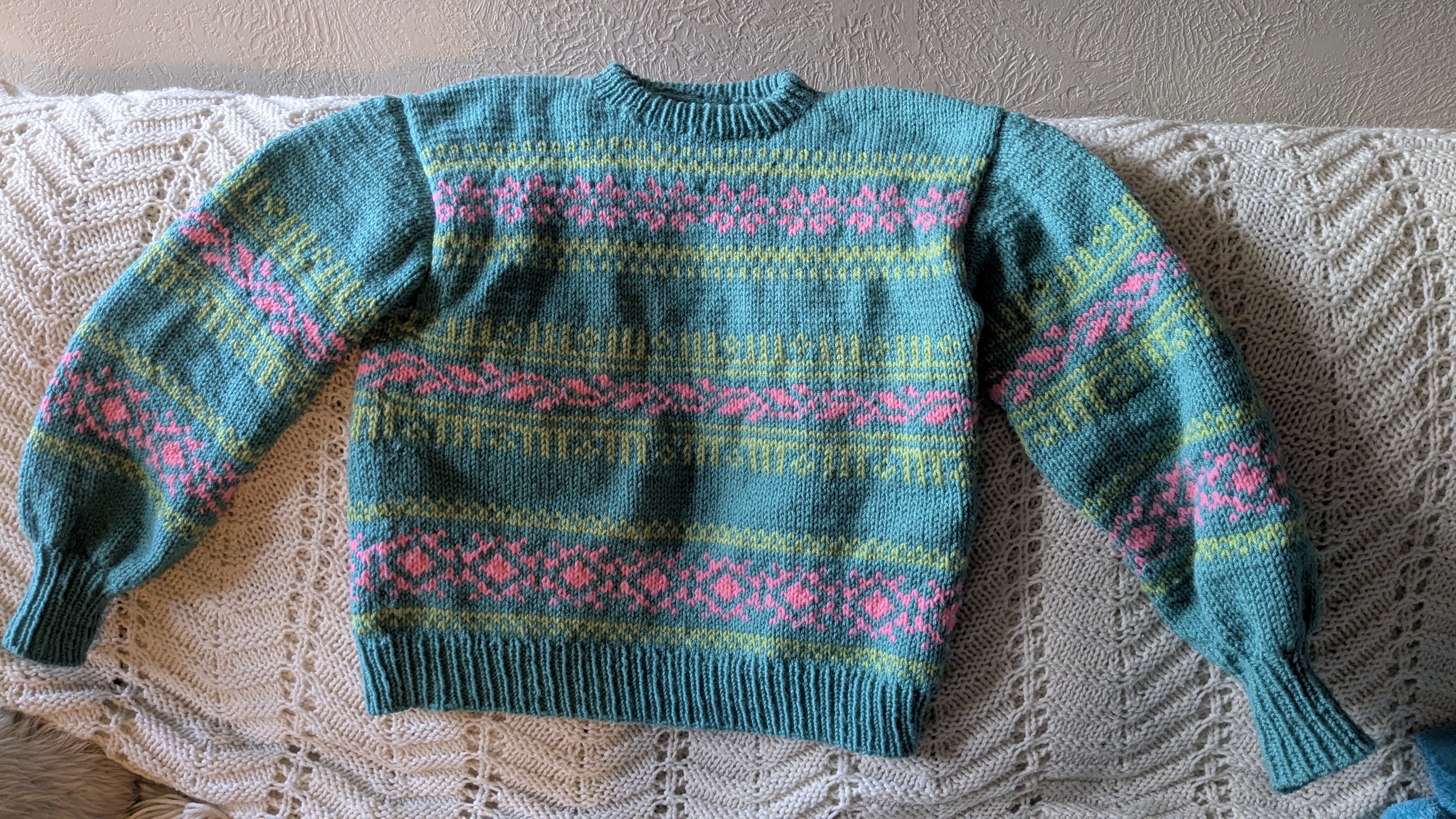 It’s my sixth homemade sweater and by far the best one. Along with redoing the pattern math to work with thicker yarn, I made it more form-fitting (the pattern is designed to be oversized), added German short rows to the caps of the sleeves, and made the sleeves more bubble-shaped instead of open at the wrists. I’m thrilled with how it came out.