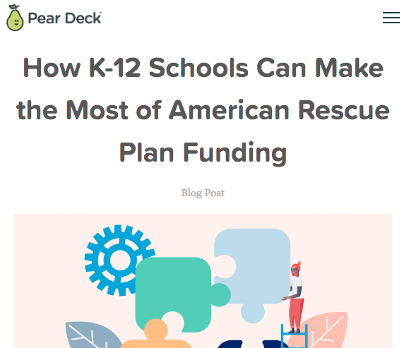 I wrote this recap of a virtual panel discussion cohosted by Pear Deck and GoGuardian. It was originally published by Pear Deck, but later moved to GoGuardian’s blog. The content is directed toward school administrators looking to understand funding available to their district’s from the American Rescue Plan passed in the wake of COVID-19.